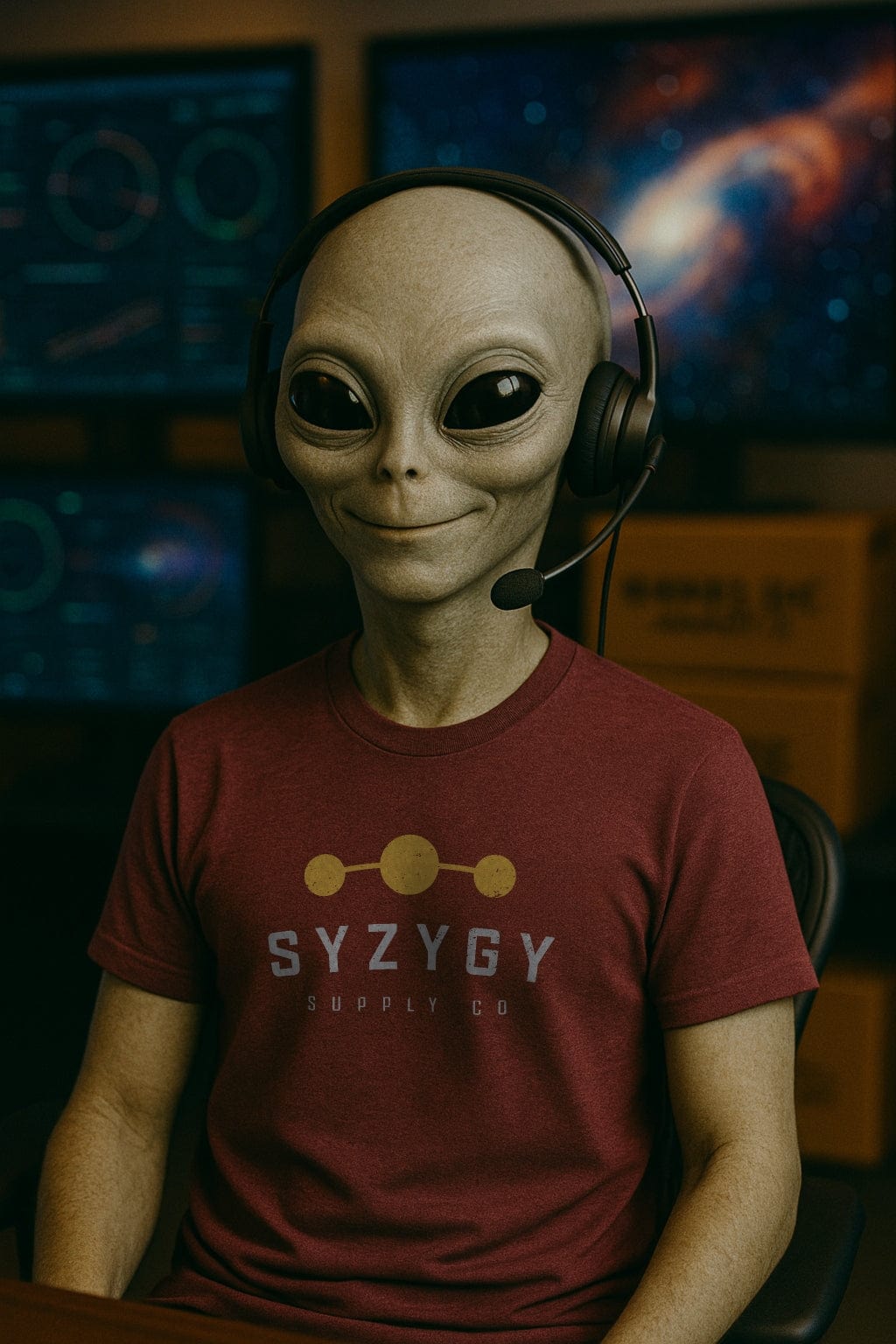 Orders shouldn’t feel like rocket science—unless you want them to. We print each tee on demand within two to three Earth days, slip it into a compostable mailer, and hand it off to tracked shipping that moves at warp-factor speed. Real-time alerts keep you in the loop from launch to landing, and if a meteor ever hits your package, Mission Control is on standby 24/7 at support@syzygysupply.com. Fast, transparent, and human, plus a satisfaction guarantee that lets you exchange or return without leaving orbit.
